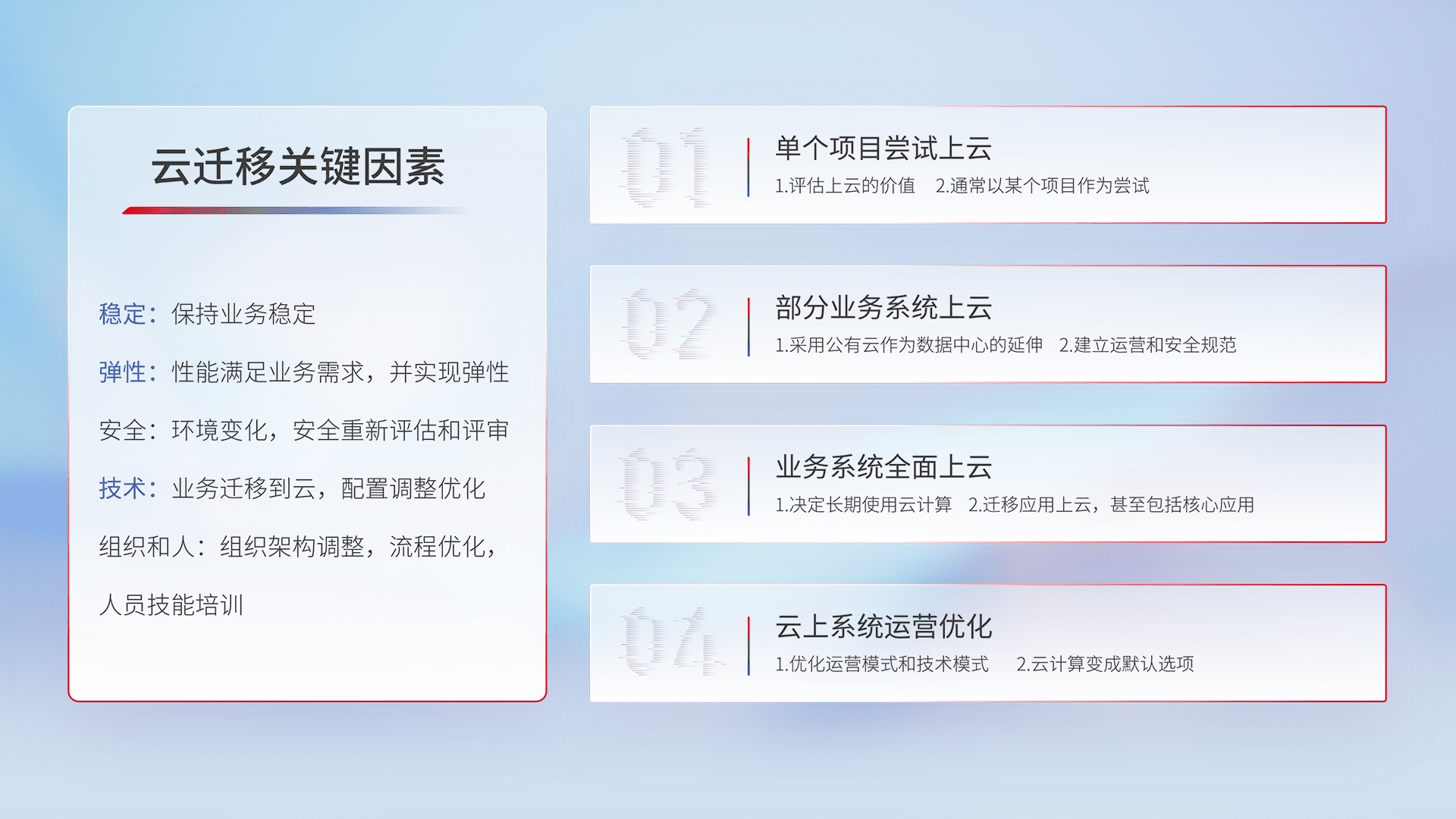 结合实际业务,,,从规划设计、、云平台选型、、、云原生改造、、数据迁移、、、、集成交付,,,,迁移全过程为客户识别最佳上云路径,,,做好风险识别管理,,,设计网络架构、、、、身份权限、、安全审计合规、、操作审计、、日志审计、、、、监控告警策略、、、、多站点容灾设计等,,,,对云上基础设施进行整体规划,,提升IT治理水平,,,,以满足弹性、、、高可用、、高性能的需求。。