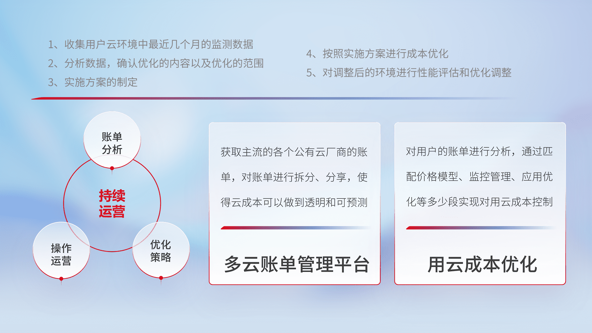 通过多云纳管,,,,以统一的资源数据模型把客户的云资源进行抽象和封装,,,进而实现对多云资源的统一操作,,保障云资源管理的可靠性、、稳定性与可用性。。。。量身定制化运维内容,,配置、、、、开发运维、、、、补丁管理、、、、备份、、、、监控、、认证和访问管理、、、、审计和日常巡检等,,,保障在用云过程中的可靠度,,,,稳定度以及高可用率。。。